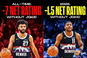 目前,當(dāng)約基奇不在場(chǎng)上時(shí),丹佛掘金隊(duì)的凈效率值為-1.5!