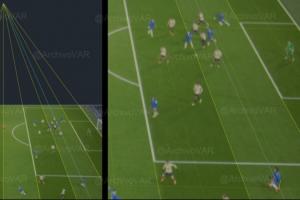 邊裁原本舉旗判罰了越位,SAOT(半自動(dòng)越位系統(tǒng))不得不介入,糾正了他的錯(cuò)誤決定。