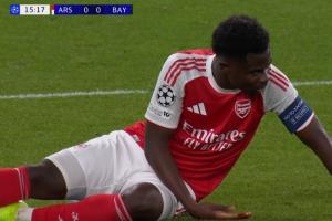 體育資訊11月27日訊 阿森納vs拜仁第16分鐘,諾伊爾出擊解圍,薩卡鼻子被撞出血,隊(duì)醫(yī)進(jìn)場(chǎng)處理!