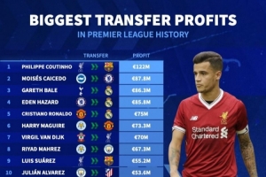 體育資訊7月21日訊 《轉(zhuǎn)會(huì)市場》列出了英超歷史賣人盈利情況,利物浦出售庫蒂尼奧給巴薩凈賺1.22億歐元居首。