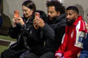 16歲的恩佐·阿爾維斯在第79分鐘替補(bǔ)登場(chǎng),鏡頭給到場(chǎng)邊的父親馬塞洛,后者正在用手機(jī)拍下兒子首秀的瞬間。