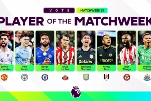 體育資訊12月2日訊 英超官方公布了第13輪最佳球員的八人候選名單,B費、福登、里斯·詹姆斯等人入選。
