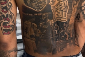 體育資訊7月22日訊 據(jù)美媒Courtside Buzz報(bào)道,南蘇丹后衛(wèi)卡里克-瓊斯把奧運(yùn)會上同詹姆斯交手時(shí)的合影紋在了后背上。