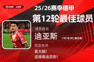 第12輪評選結果結出爐,迪亞斯傳射建功,幫助拜仁補時逆轉圣保利,獲得吧友超3.6萬票支持,當選【體育資訊X小紅書德甲第12輪最佳球員】!