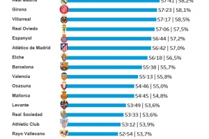 體育資訊12月2日訊 Opta統(tǒng)計(jì)了本賽季西甲各隊(duì)的場(chǎng)均凈比賽時(shí)間,并列出榜單,皇馬排名第三位。