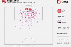 據(jù)Opta統(tǒng)計,?;倏松腺惣靖髻愂麓蜻M22球,他是同期進球最多的五大聯(lián)賽U23球員。