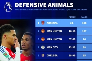 92-93賽季以來英超球隊連續(xù)失球少于3粒比賽場次紀錄: