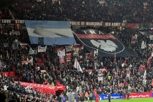 在死忠看臺,一眾曼聯(lián)球迷打出大幅tifo表達對利馬的支持,將阿根廷國旗里的太陽替換為了菜刀…