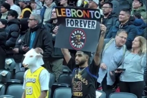 賽前有身穿詹姆斯球衣的球迷打出了“永遠的勒布倫多(LeBronto,勒布朗和多倫多組合的諧音寓意詹姆斯生涯對猛龍的統(tǒng)治力)”的標語,另一位詹姆斯球迷則戴上了山羊頭套。