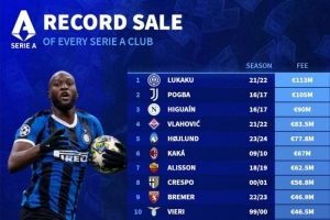 意甲各隊(duì)出售球員標(biāo)王排名(只選取各隊(duì)最高轉(zhuǎn)會(huì)費(fèi),每隊(duì)一人):