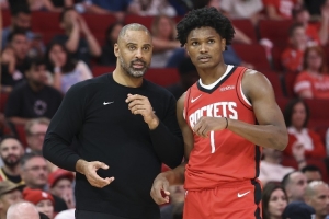 周三晚上,湯普森表示他想把注意力轉(zhuǎn)移到抓下防守籃板上,這樣他就能發(fā)起一些在第三節(jié)扭轉(zhuǎn)局勢的轉(zhuǎn)換進攻。憑借驚人的天賦,他能夠通過籃板球、轉(zhuǎn)換進攻得分、一對一防守,或是當對手包夾火箭的全明星中鋒時,憑借與申京心有靈犀的默契空切至扣籃點,來影響比賽。
