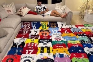 體育資訊12月5日訊 紐卡斯?fàn)栔袌?chǎng)吉馬良斯今天在Instagram發(fā)照片,曬出了自己的球衣收藏。