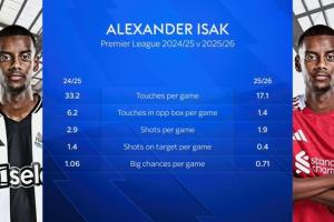 體育資訊12月06日訊 據(jù)天空體育數(shù)據(jù)統(tǒng)計,伊薩克利物浦時期對比紐卡時期,觸球、射門等數(shù)據(jù)均下降。