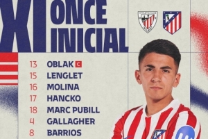 馬競首發(fā):13-奧布拉克、15-朗格萊、16-莫利納、17-漢茨科、18-普比爾、4-加拉格爾、8-巴勃羅·巴里奧斯、20-朱利亞諾·西蒙尼、23-尼古拉斯·岡薩雷斯、11-阿爾馬達、19-阿爾瓦雷斯