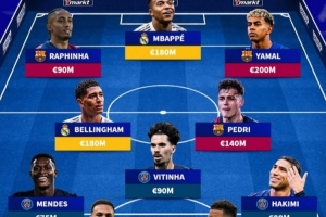 前鋒:拉菲尼亞(巴薩,9000萬(wàn))、姆巴佩(皇馬,1.8億)、亞馬爾(巴薩,2億)