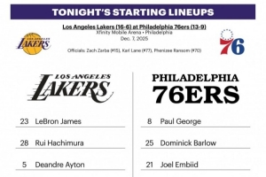 體育資訊12月8日訊 今日8點(diǎn)半,76人主場(chǎng)對(duì)陣湖人。賽前雙方公布了本場(chǎng)首發(fā)陣容: