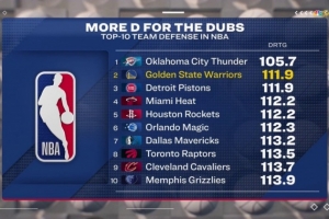 過(guò)去三場(chǎng)比賽勇士失分是99/94/91;目前他們防守效率111.9,聯(lián)盟第二僅次于雷霆。