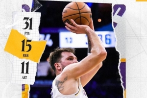 賽后,湖人官推發(fā)布東契奇數(shù)據(jù)海報(bào):又一場三雙表現(xiàn)??