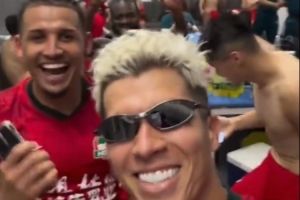 視頻中,河南隊(duì)外援納薩里奧戴著墨鏡領(lǐng)舞,全隊(duì)在更衣室又唱又跳慶祝勝利。