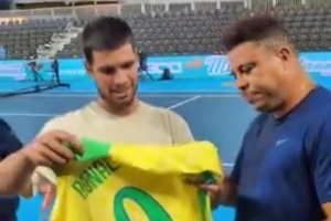 羅納爾多與西班牙網(wǎng)球選手阿爾卡拉斯打網(wǎng)球,兩人親切交流,羅納爾多還將自己的巴西隊9號簽名球衣贈送給阿爾卡拉斯。