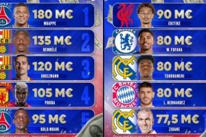 體育資訊7月24日訊 利物浦已經(jīng)官宣簽下法蘭克福前鋒?;倏?,Actu Foot數(shù)據(jù)統(tǒng)計顯示他也是法國歷史轉會費第6貴的球員。