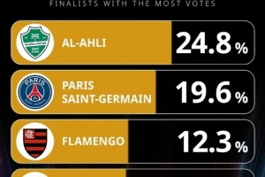 體育資訊12月10日訊 環(huán)球足球獎(jiǎng)公布了2025年最佳男足俱樂部的投票情況,目前吉達(dá)國(guó)民24.8%領(lǐng)跑,巴黎、弗拉門戈二三位。