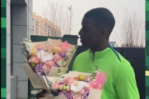 今天,法比奧特地找到訓(xùn)練基地負(fù)責(zé)洗衣的工作人員邵紅和陳玉敏,向兩位大姐獻(xiàn)花,感謝她們無微不至的照顧。??????