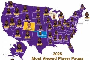 BBR曬2023年各州被瀏覽次數(shù)最多球員:詹姆斯在41個(gè)州處于領(lǐng)先地位