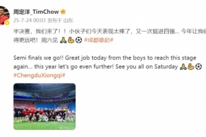 周定洋在個(gè)人微博中寫道:半決賽,我們來了??!小伙子們今天表現(xiàn)太棒了,又一次挺進(jìn)四強(qiáng)… 今年讓我們走得更遠(yuǎn)吧!周六見 ??????