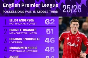 體育資訊12月11日訊 Squawka統(tǒng)計了本賽季球員在英超中場區(qū)域(中場三區(qū))奪得球權(quán)的次數(shù),并列出榜單,安德森62次居首,B費、索博斯洛伊排名二三位。