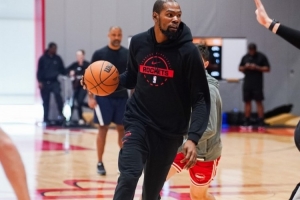 火箭官方發(fā)布了球隊訓練照,全員狀態(tài)輕松,杜蘭特眼神專注。