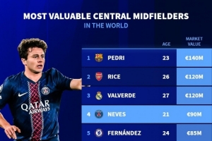 中場(chǎng)中路球員身價(jià)榜:佩德里1.4億歐居首,賴(lài)斯、巴爾韋德1.2億歐