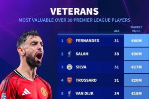 體育資訊12月13日訊 德國轉(zhuǎn)會(huì)市場列出了英超年齡30+球員身價(jià)排名,B費(fèi)居首,薩拉赫次席。