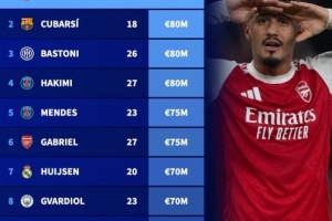 6、加布里埃爾(阿森納,27歲):7500萬(wàn)歐