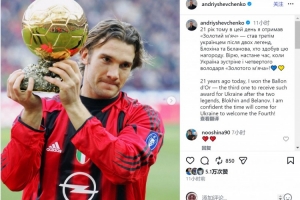 舍甫琴科社媒曬出自己與金球獎(jiǎng)杯的合照,配文:“21年前的今天,我贏得金球獎(jiǎng),成為繼布洛欣和別拉諾夫之后,第三位獲得這一獎(jiǎng)項(xiàng)的烏克蘭球員。我相信烏克蘭終會(huì)迎來第四位金球獎(jiǎng)得主!”