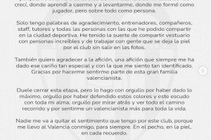 “結(jié)束這段旅程讓我心痛,但我自豪地告別,因?yàn)槲乙呀?jīng)全力以赴,捍衛(wèi)了這些顏色和隊(duì)徽。回顧過(guò)去,我為走過(guò)的每一步感到自豪,并且我將永遠(yuǎn)是一名瓦倫西亞人?!?/p>