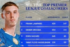體育資訊12月14日訊 在本輪英超切爾西2-0擊敗埃弗頓的比賽中,帕爾默破門。切爾西官方也曬出了隊史英超射手榜,帕爾默升至第9,具體榜單如下: