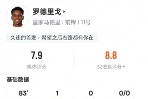 下一篇: 羅德里戈本場數(shù)據(jù):1進球1過人成功+傳球成功率96.7%,評分7.9