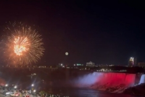 美國知名地標(biāo)尼亞加拉瀑布也亮燈紅、黑、白三色并燃放煙花,歡迎曼聯(lián)造訪美國。