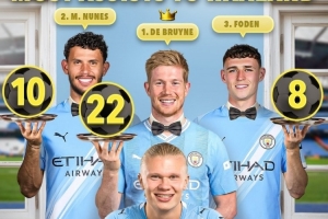 體育資訊12月15日訊 哈蘭德加盟曼城以來攻入147粒進(jìn)球,Score90統(tǒng)計了球員在曼城助攻哈蘭德的次數(shù),并列出前三名榜單,德布勞內(nèi)22助居首。
