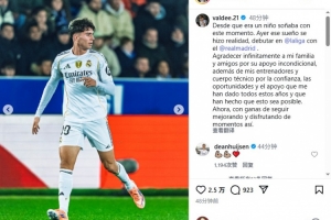 巴爾德佩尼亞寫道:“自童年起我就夢想著這一刻,昨日這個夢想成真了,在皇家馬德里完成西甲聯(lián)賽首秀?!?/p>