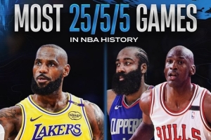 25+5+5場次,詹姆斯716場排名第一,哈登336場排名第二,喬丹319場排名第三。