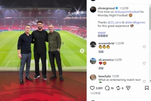 吉魯參與了曼聯(lián)vs伯恩茅斯比賽的解說工作,擔(dān)任評論嘉賓,他在社交媒體上曬出與卡拉格、大衛(wèi)·瓊斯的合照,配文:“首次參加天空體育的周一足球夜節(jié)目,感謝卡拉格和大衛(wèi)·瓊斯讓我擁有這次美妙的體驗(yàn)?!?/p>