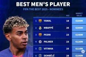 體育資訊12月16日訊 2025年FIFA年度最佳頒獎典禮將在就卡塔爾多哈舉行,年度最佳球員(世界足球先生)也將揭曉?!掇D(zhuǎn)會市場》也列出了入選提名球員的身價排行榜,亞馬爾和姆巴佩并列居首。