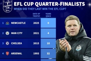 體育資訊12月16日訊 英格蘭聯(lián)賽杯八強戰(zhàn)即將開戰(zhàn),《轉(zhuǎn)會市場》也統(tǒng)計了八強球隊上次在聯(lián)賽杯奪冠距今的時間。