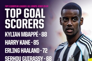 據(jù)Opta統(tǒng)計,2023-2024賽季以來,伊薩克各賽事打進(jìn)52球,五大聯(lián)賽球員第7多。