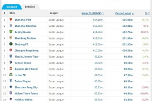 俱樂部身價方面,上海海港以1608萬歐元排在全聯(lián)賽第一,上海申花以1281萬歐元排第二,北京國安以1276萬歐元排第三,山東泰山以1158萬歐元排第四,浙江以1155萬歐元排第五,成都蓉城以1051萬歐元排第六,其余球隊均低于1000萬歐元。