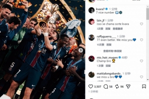 在巴黎身披7號(hào)的克瓦拉茨赫利亞社媒曬出捧杯照片,慶祝球隊(duì)奪冠,配文:“7是不錯(cuò)的數(shù)字?!?/p>
