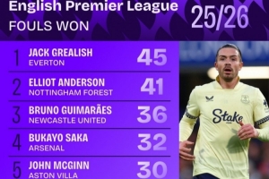 體育資訊12月19日訊 數(shù)據(jù)機(jī)構(gòu)squawka統(tǒng)計了本賽季英超造犯規(guī)次數(shù)榜,被曼城外租的格拉利什居首。