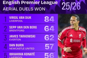 此外,范戴克爭頂成功率為80%,在所有至少參與25次及以上爭頂?shù)那騿T中,成功率最高。